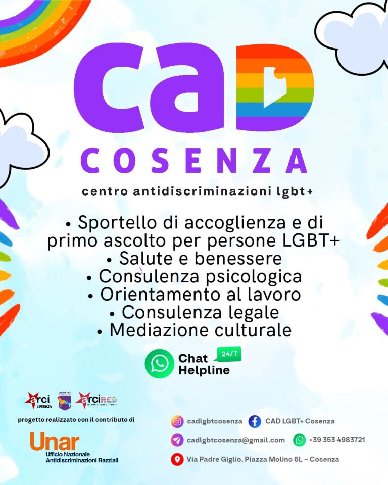 Il Centro Anti Discriminazioni – CAD LGBT+ Cosenza rappresenta un punto di riferimento essenziale per la comunità LGBT+ nel territorio cosentino, offrendo supporto, tutela e strumenti concreti per combattere le discriminazioni basate su orientamento sessuale e identità di genere. In un contesto ancora segnato da stigma e pregiudizi, il Centro lavora quotidianamente per garantire assistenza alle persone che si trovano in difficoltà, aiutandole a superare ostacoli di natura sociale, familiare, lavorativa e sanitaria. La missione del Centro è quella di costruire un ambiente più accogliente e aperto, in cui ogni persona possa sentirsi libera di esprimere la propria identità senza paura di discriminazioni o rifiuto.